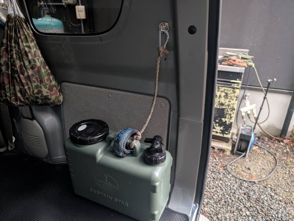 実はさっきの海での写真、よく見るとポリタンクが倒れないように壁にロープで固定してあるでしょ?