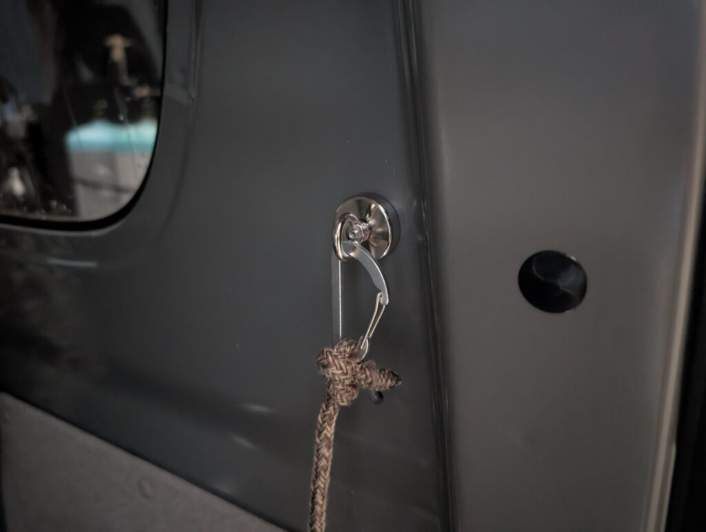 貼り付けたマグネットフックにロープやゴムバンドを通し、それをポリタンクの取っ手に繋ぐことでタンクをしっかりと固定します。