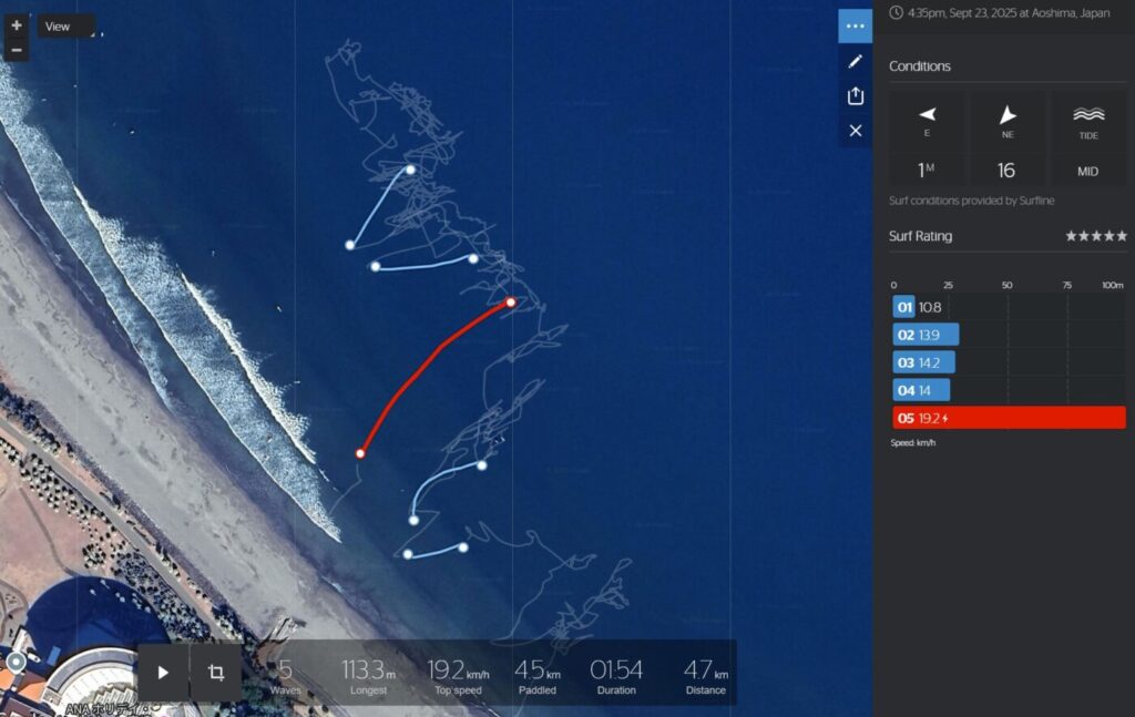 自分のサーフィンの乗った本数や動いた軌跡などが記録され確認できます。