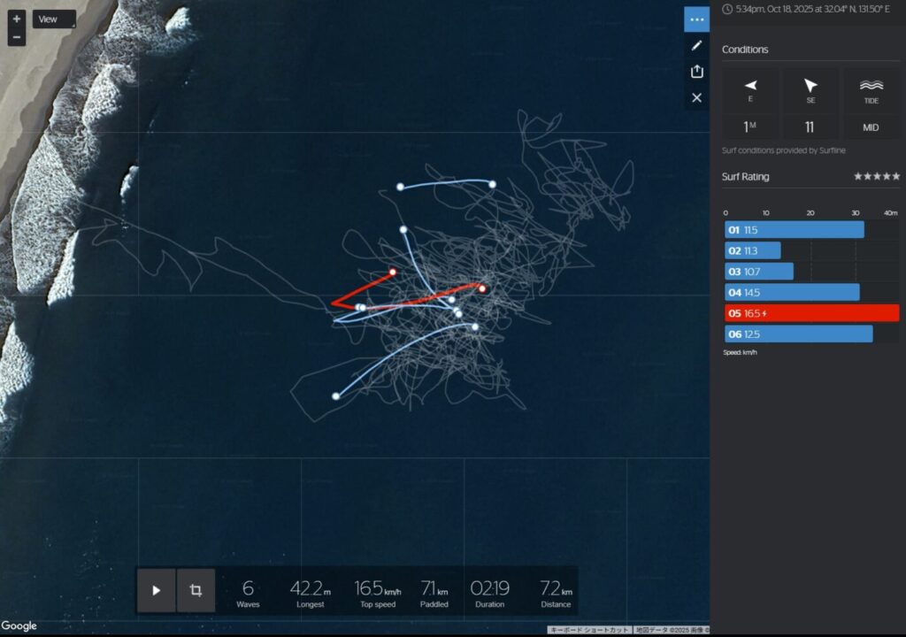 自分のサーフィンの乗った本数や動いた軌跡などが記録され確認できます。