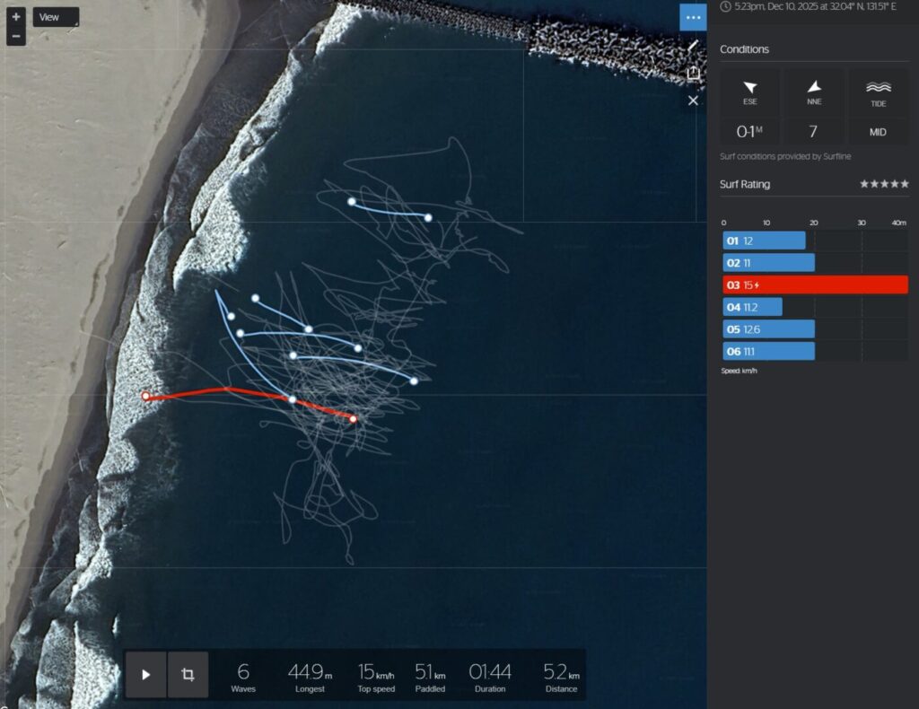 自分のサーフィンの乗った本数や動いた軌跡などが記録され確認できます。