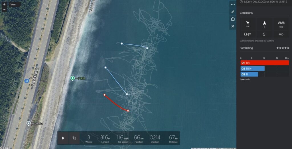 自分のサーフィンの乗った本数や動いた軌跡などが記録され確認できます。