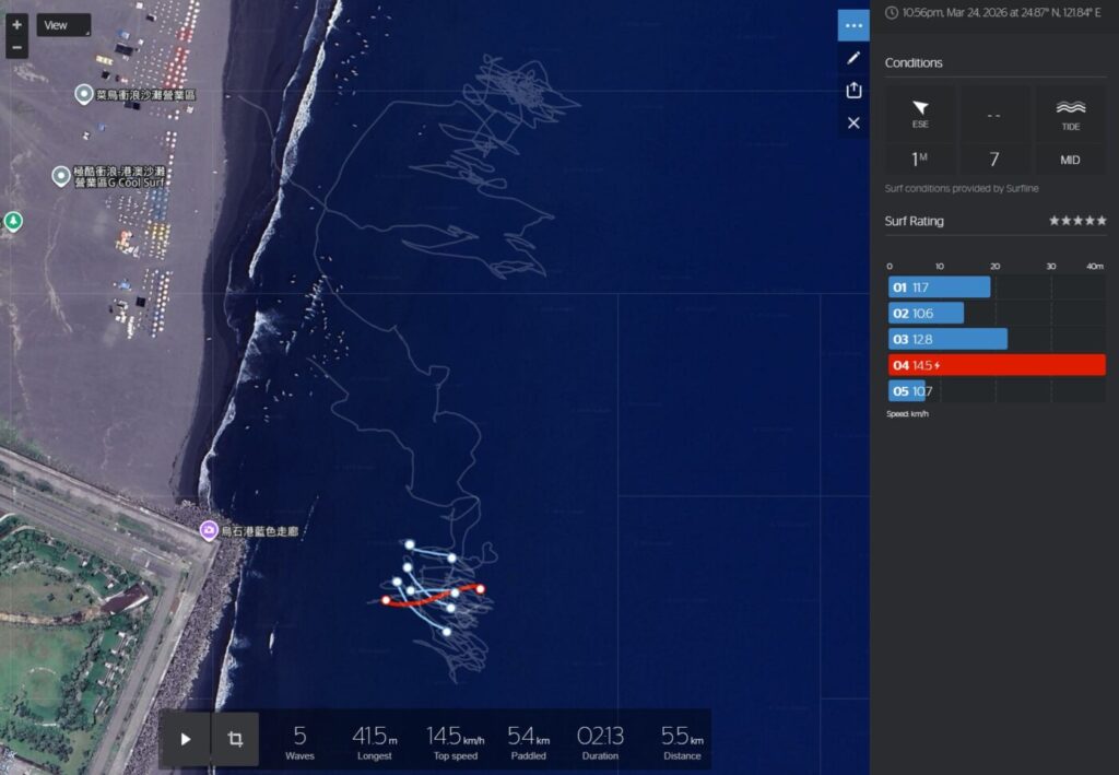 自分のサーフィンの乗った本数や動いた軌跡などが記録され確認できます。