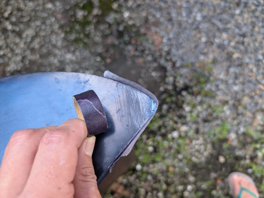 小さな傷のうちにこうして自分で直しちゃえば、浸水を防いでボードも長持ちするから覚えておいて損はないね