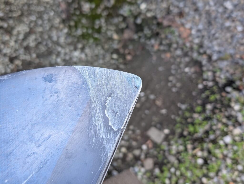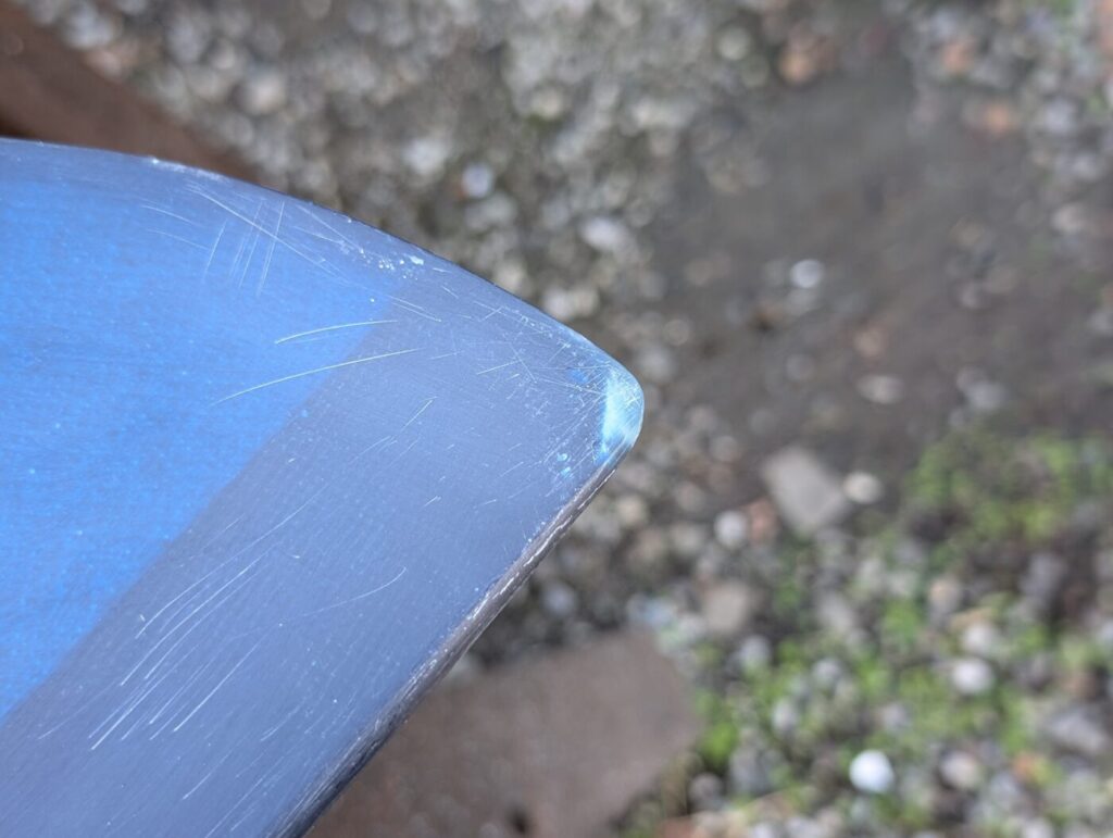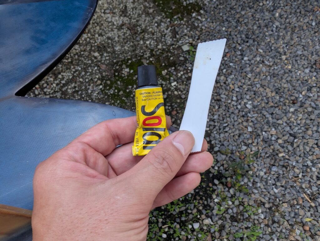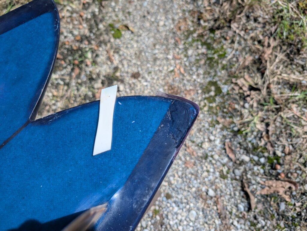 んー、場所がテールの角(エッジ)だから、テープだとすぐ剥がれそうで…。でもショップに出すほどじゃないし
