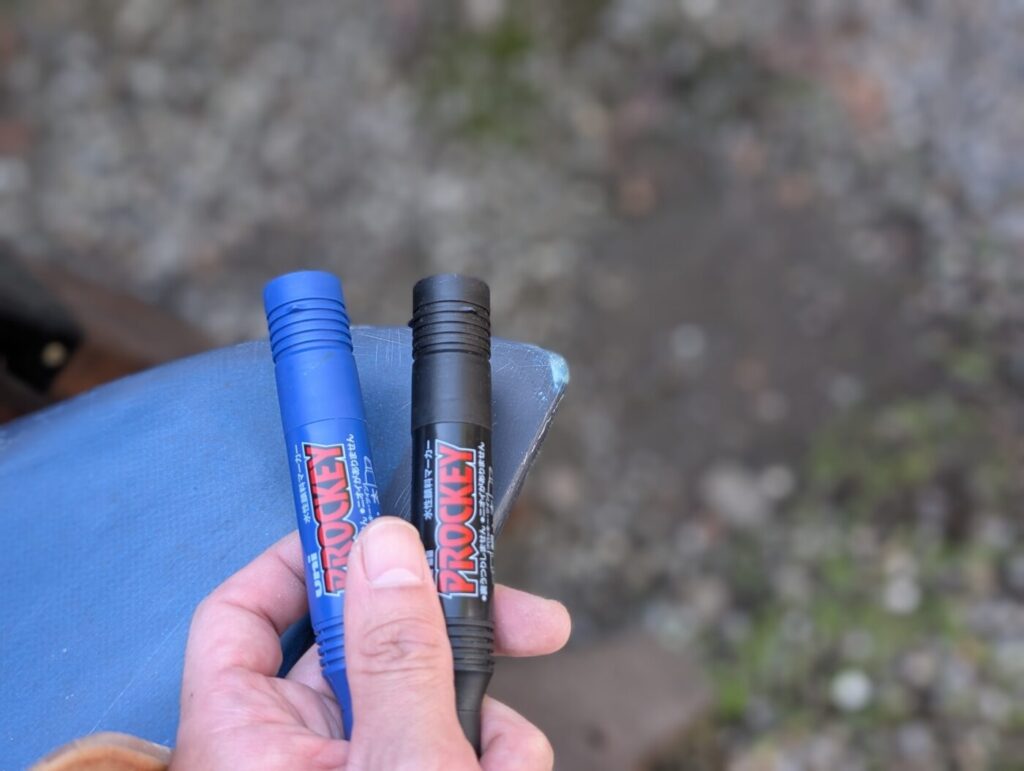 そこでボードの色に近い油性のカラーマジック(今回は青と黒)やスプレーで軽く色付けします。
